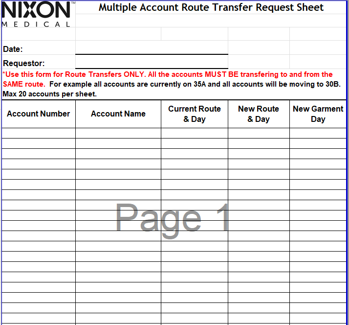 - Multiple Account Route Transfer Request Sheet is utilized for transferring multiple accounts between routes. It includes fields for the date and requestor's information. The form specifies that it should be used exclusively for route transfers, where all accounts listed must be transferring from the same current route to the same new route. For example, all accounts currently on route 35A will be moved to route 30B. The form accommodates up to 20 accounts per sheet and requires details such as the account number, account name, current route and day, new route and day, and the new garment day for each account. This structured approach ensures an organized and consistent transfer process for multiple accounts.