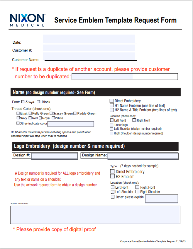 - Service Emblem Template Request Form is used to request the creation or duplication of service emblems for customer accounts. It includes fields for the date, customer number, and customer name. The form requires a copy of the digital proof of the emblem to be provided. If the request is a duplicate of an existing account, the customer number of the account to be duplicated must be included. This ensures that the service emblems are accurately created or replicated, maintaining consistency and meeting customer requirements.