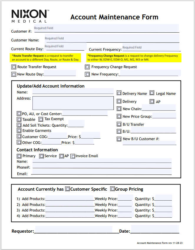- Account Maintenance Form is designed for updating or adding account information, including customer-specific group pricing. It captures detailed contact information such as the customer number, name, current route day, frequency, and contact details (name, phone number, email). It accommodates requests for route transfers or frequency changes, with fields for the new route day, frequency, delivery name, legal name, address, new chain, and new price group. It also includes sections for B/U transfers, adding products with corresponding weekly prices and quantities, primary service, AP, invoice email, PO/AU/Cost Center, tax status, and adding soil tickets and garment enablement. The form ensures comprehensive data capture for accurate account maintenance and service management.