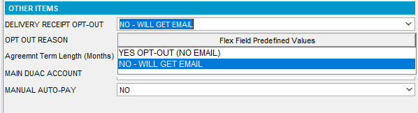 In the Customer record in the Flex Fields tab, there is the Delivery Receipt Opt-Out option. The default is No -Will Get Email. If Yes – Opt-Out (NO EMAIL) is selected, then the customer will not get the Delivery Conformation Receipt email.