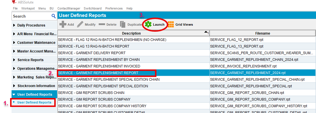 - Select SERVICE-GARMENT REPLENISHMENT REPORT