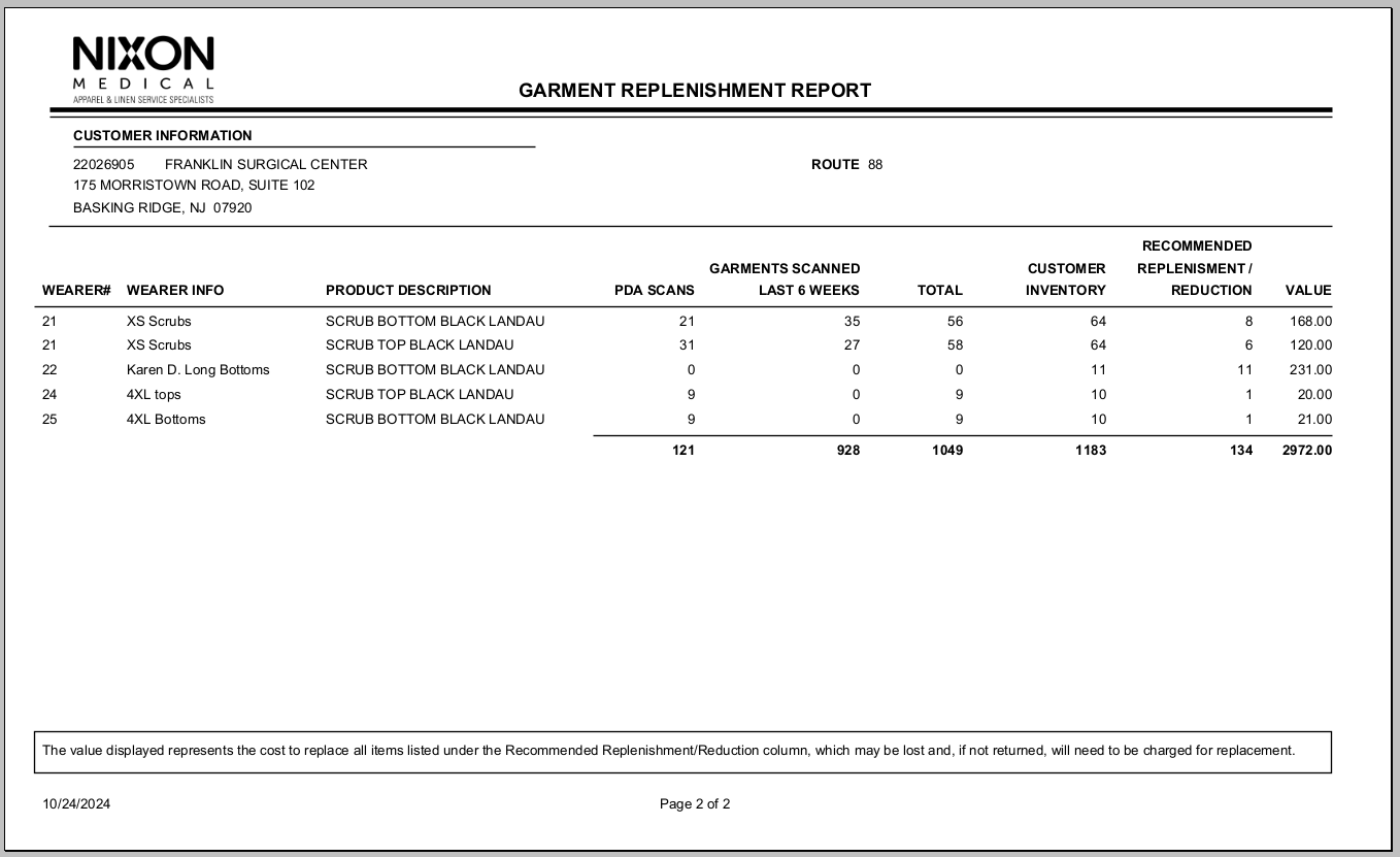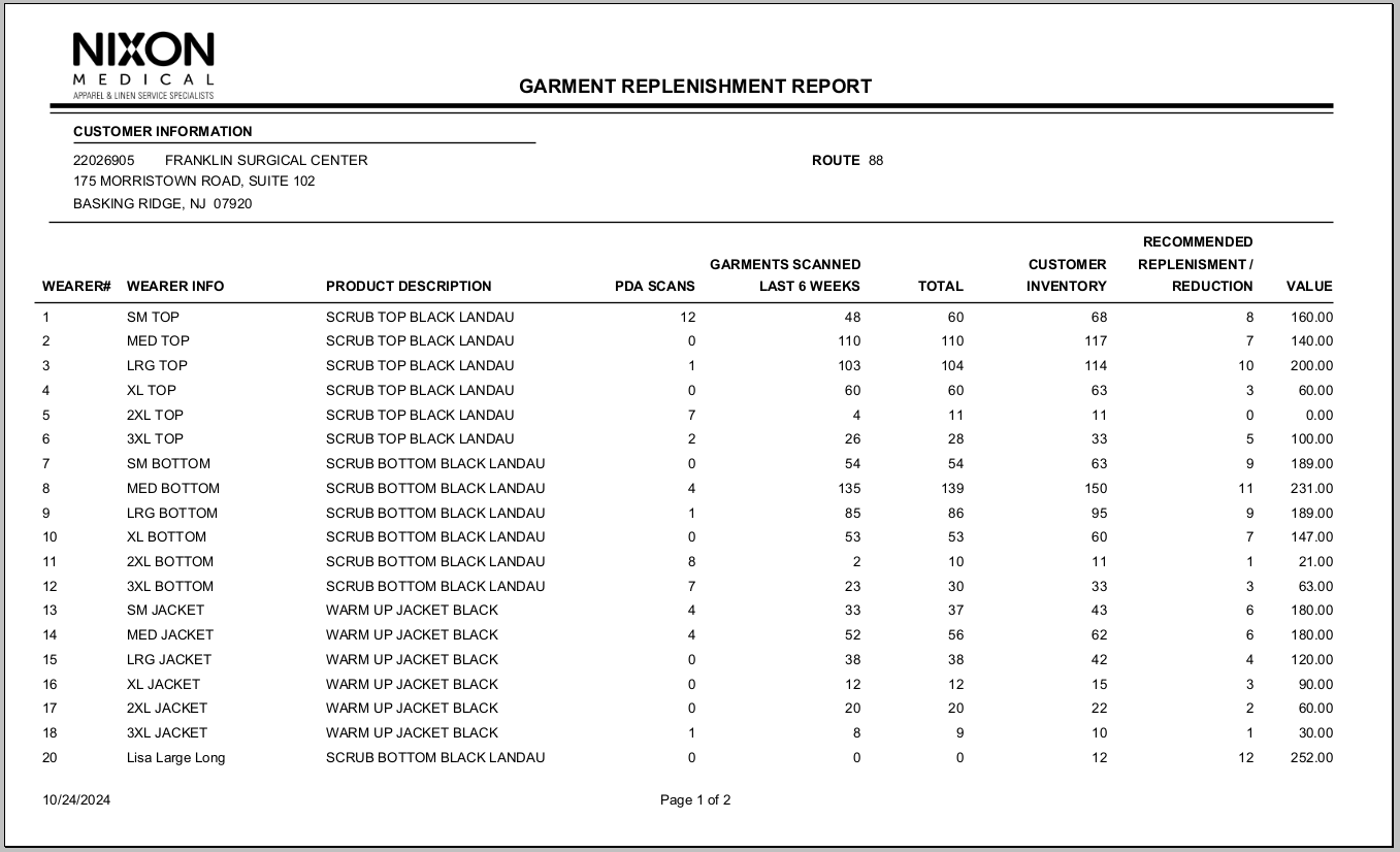 - Output: The Garment Replenishment Report summarizes critical garment inventory data to ensure customers receive accurate service and billing. By identifying discrepancies between scanned and invoiced garments, Service Managers can proactively address inventory issues, avoid overcharging or under-delivery, and help ensure that customers maintain appropriate garment inventory levels for their operations.