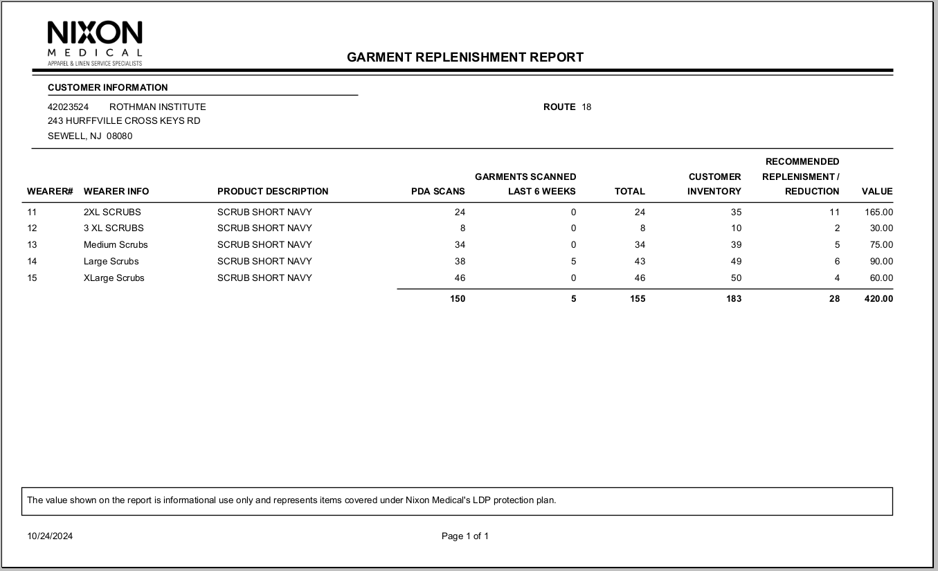 Please note that the footer on the Garment Replenishment Report will vary based on whether the customer is enrolled in LDP or not paying for LDP (LDPX). The footer above is for a customer enrolled in LDP.