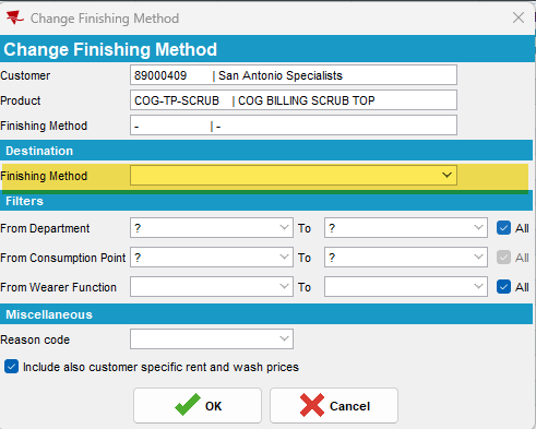 You’ll select the desired finishing method from the drop down. It’ll run through a process that updates the records and it will mark an end date for the existing product as the current date you’re updating it on and mark the product as new with the finishing method that you wanted. Just a basic swap essentially. It also updates all the delivery variations, wearers, consumption points, etc. automatically.