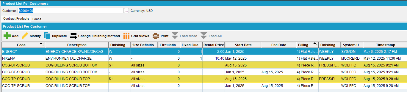 Here you can see the 'new' products with the finishing method you selected are highlighted and the products with the old finishing method have been marked with an end date. Be sure to hit save.