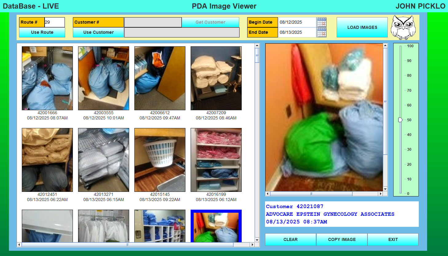 PDA Image Viewer. In the top selection panel, click on Use Route to enter a Route number. Or click on Use Customer to be customer specific. Enter the Begin and End dates – then click Load Images.