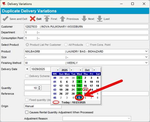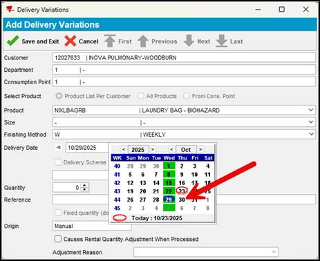 1. Select the service date of the first delivery for the new product. Highlighted in red is the current day and highlight in green are the Service days for this customer. In the example below, this customer received the linen delivery on Wednesday each week.