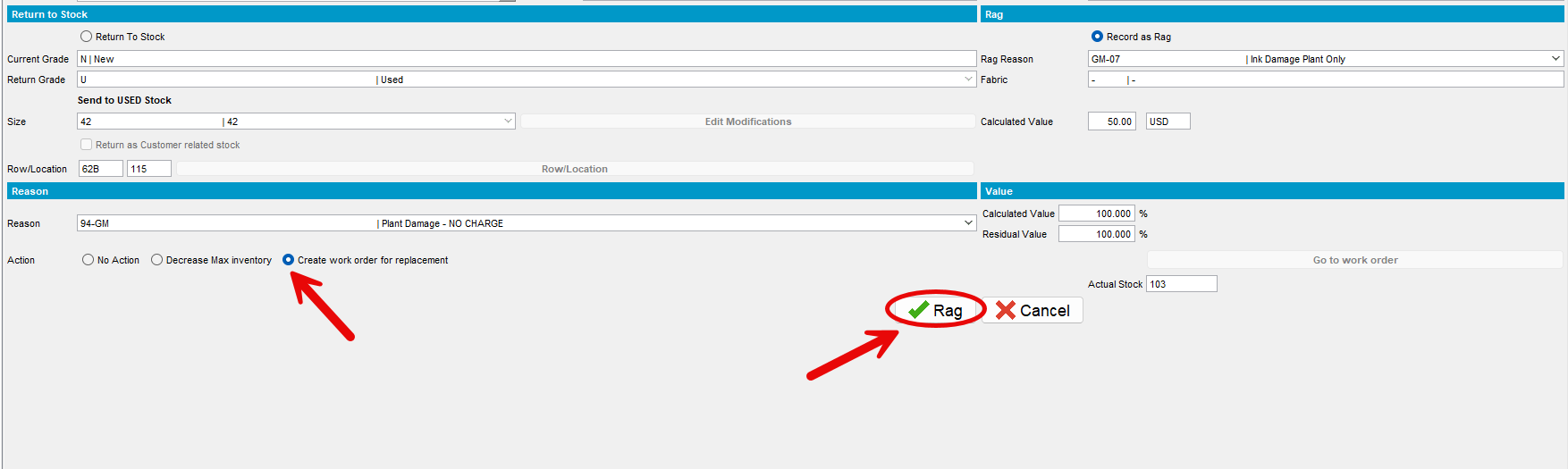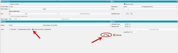 1. Select Create work order for replacement and then click Rag