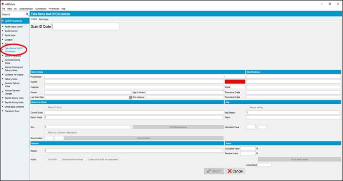 2. Replacing garments are performed using the Take Items Out of Circulation icon