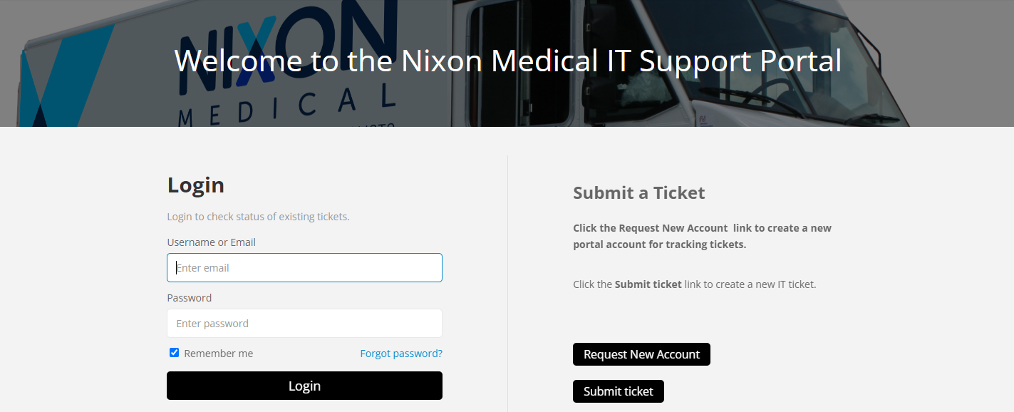 Portal: Travel to https://nixonmedical.happyfox.com to submit, view, and track IT tickets.