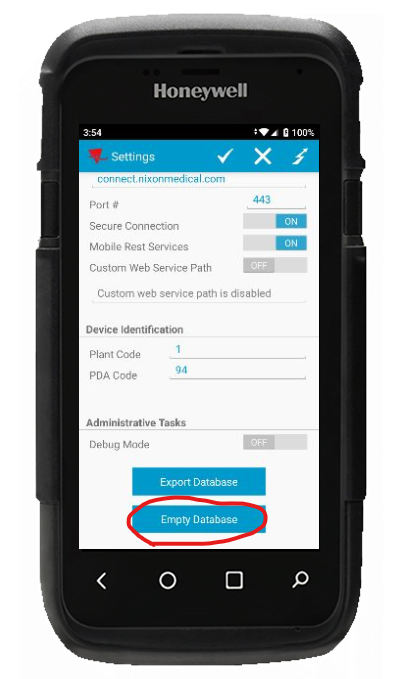 3. Confirm that Mobile Rest Services is ON, then scroll down and press Empty Database. After this, press the lightning bolt button to confirm the PDA can connect to the laundry server.