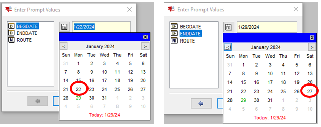- Enter the beginning (BEGDATE) and end date (ENDDATE) of the week you would like to view