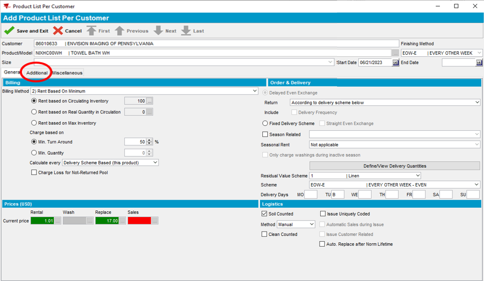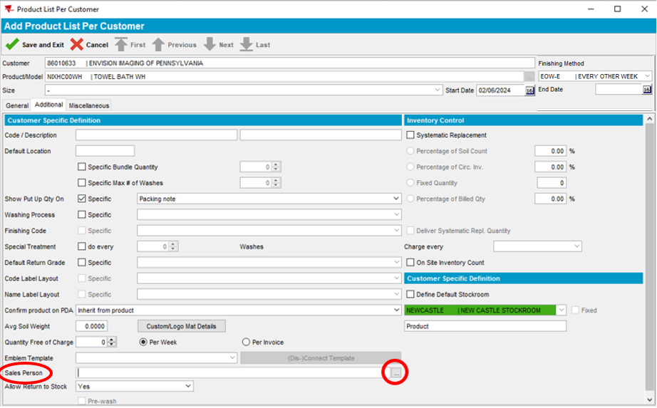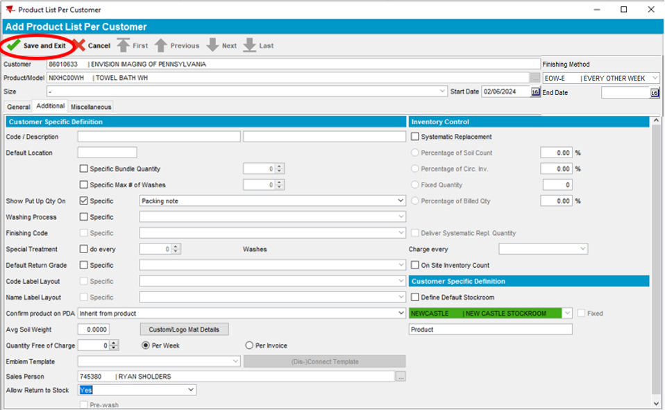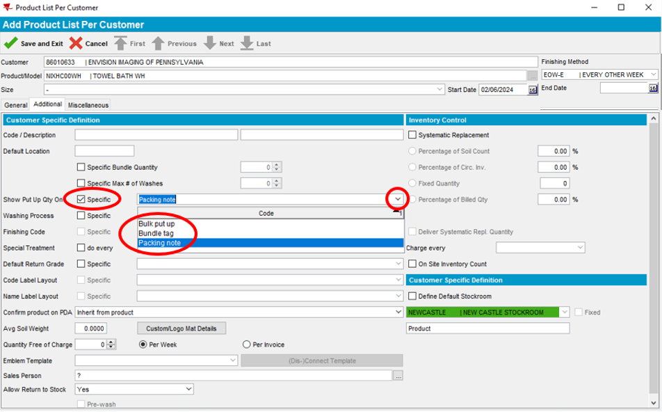 Note: The Packing Note section determines whether the RSR receives a dedicated blue rolling cart containing product for this customer only, or a Bulk Put Up which contains product for multiple customers. It is important that the selection is consistent for all products on the account. If you are unsure, click on another linen item under Description and view the Additional tab under that product. Bundle Tag is not used and should never be selected as an option.