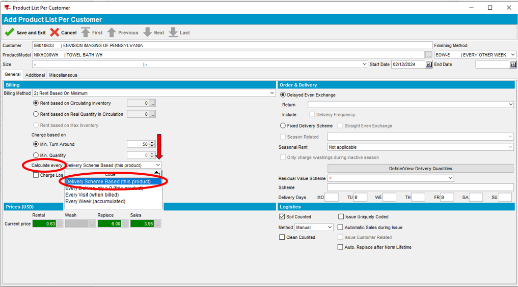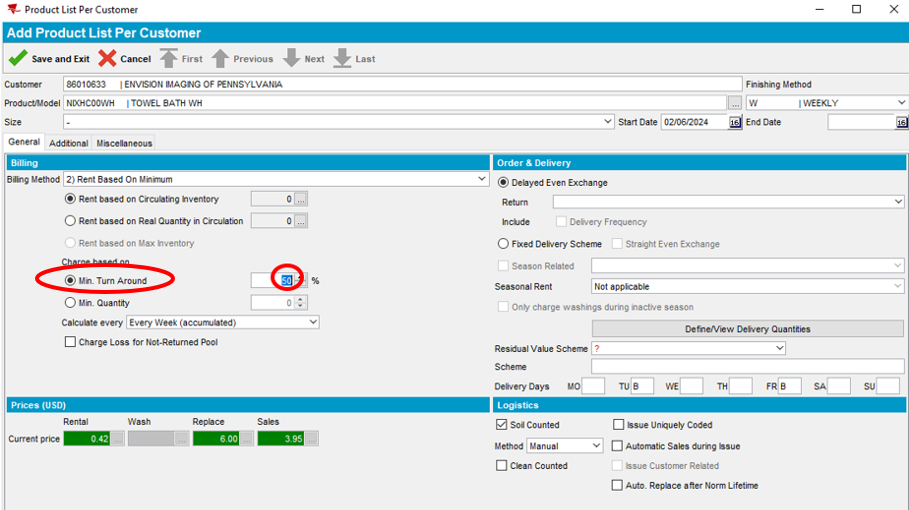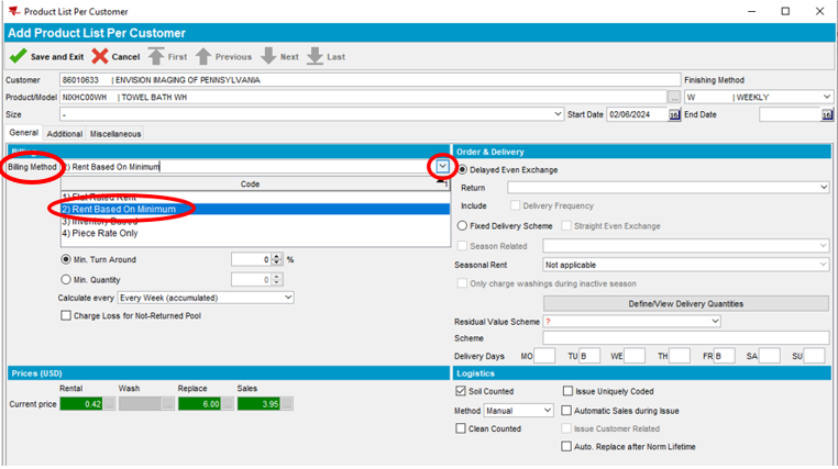 - Select the dropdown next to Billing Method and select Rent Based On Minimum. This option allows invoice billing and soil counting based on circulating inventory.
