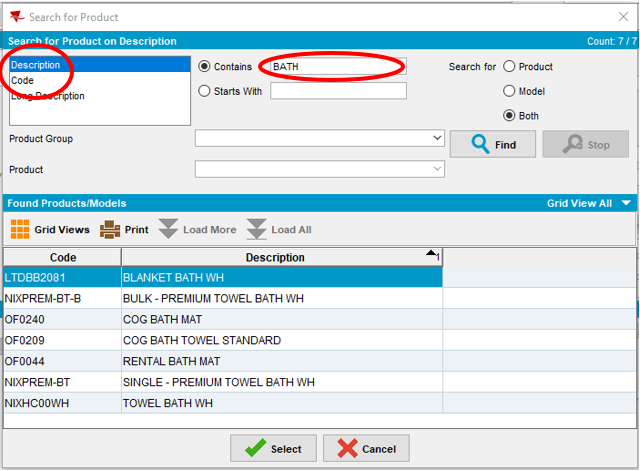 - Select the product description or enter the numeric code of the product to be added in the “Contains” field