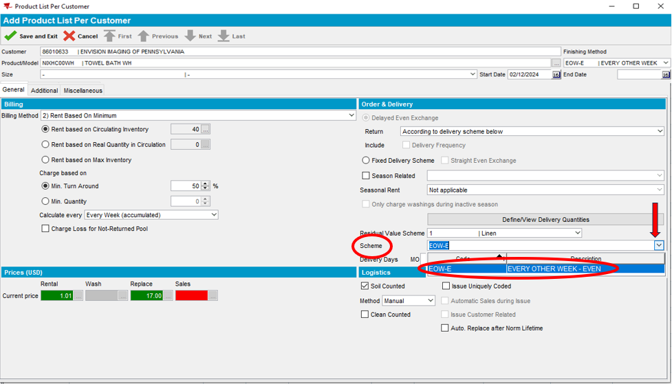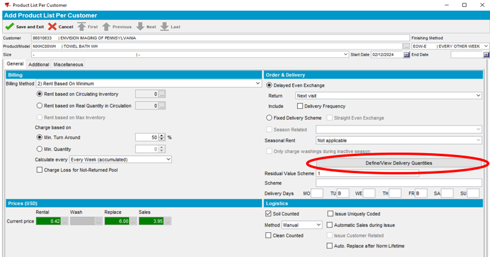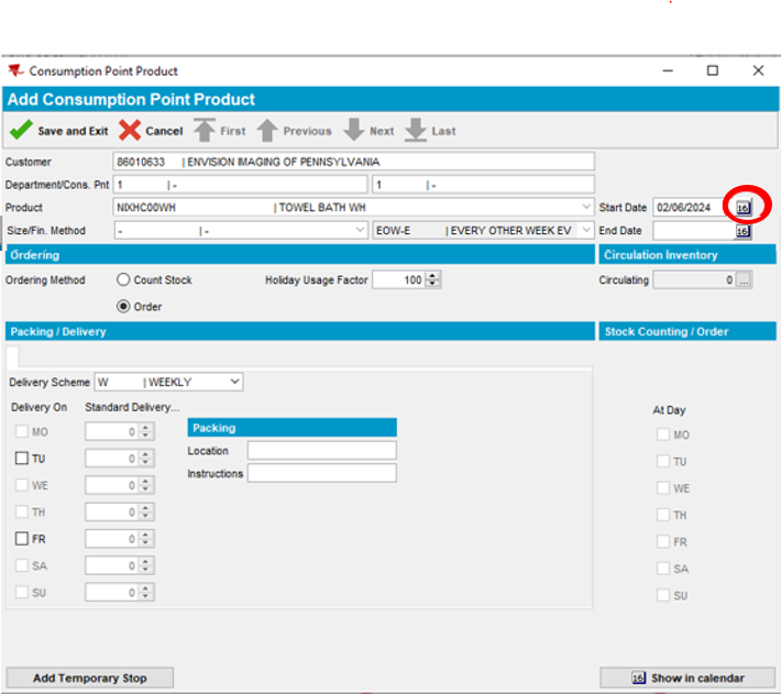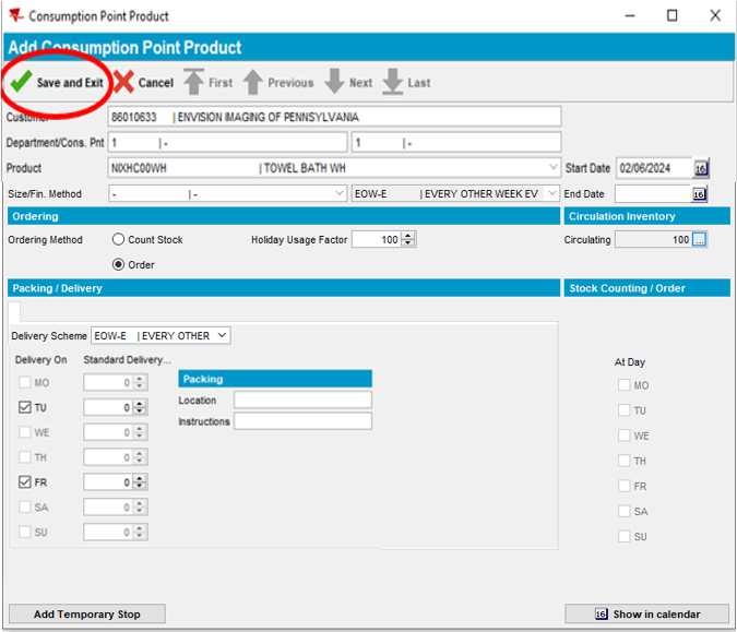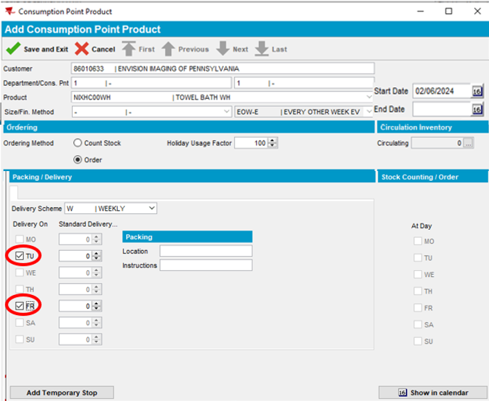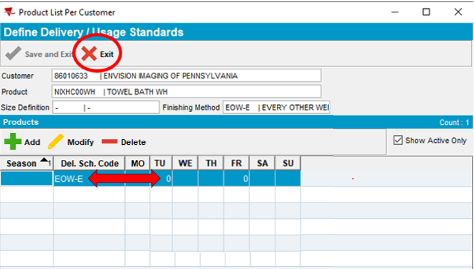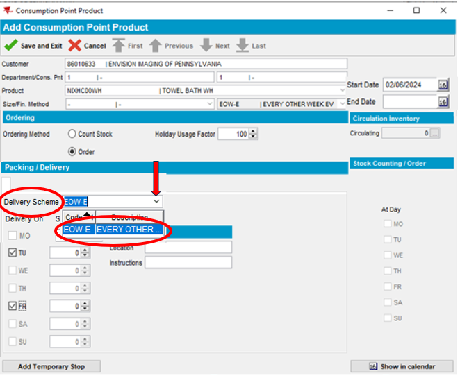 Note: The Del. Sch. Code has now been added and appears automatically in the Products section below. (EOW-E = Every Other Week Even). Product delivery days are set to (TU = Tuesday, FR = Friday) according to the customer service days in our example.