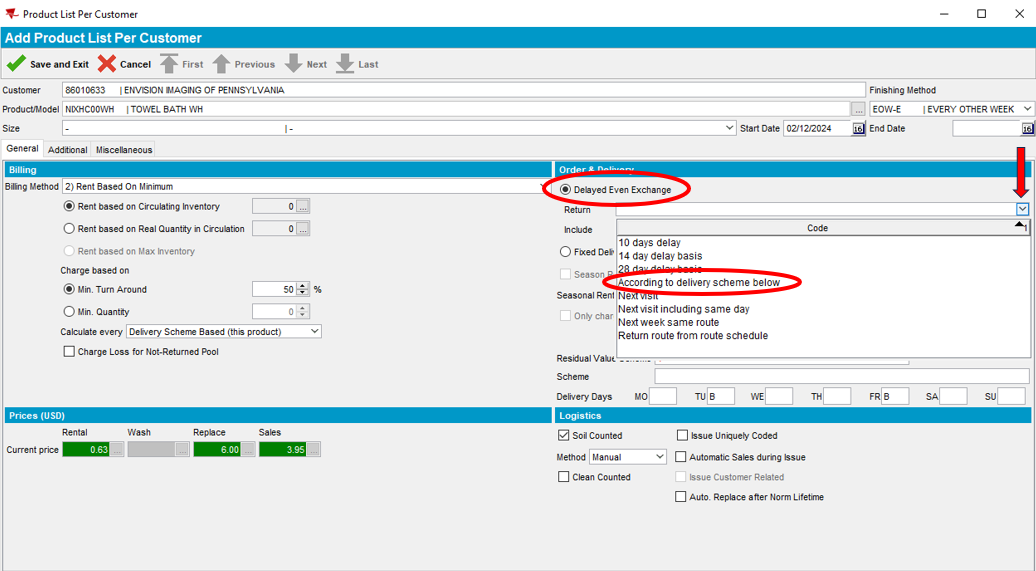 - Select the dropdown next to Delayed Even Exchange and select According to delivery scheme below. This ensures that the product will be on invoice on a EOW or Monthly basis per the Finishing Method.