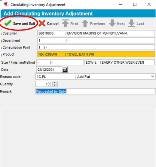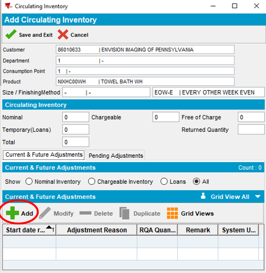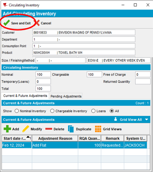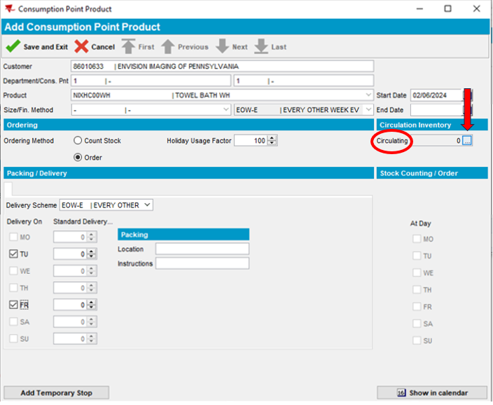 - Enter the Quantity (Circulating Inventory). Circulating inventory is 2x the quantity the customer requires at the facility to service customers. While product is being actively used at the customer facility, an equal quantity is required to be in process at the plant being cleaned and laundered for the next scheduled delivery.