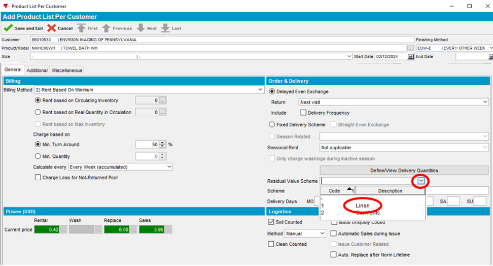 - Select the dropdown next to Residual Value Scheme and select Linen. This ensures that the flat item selected aligns with our product category.