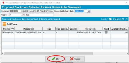 Note: Proposed Stockroom Selection of Work Orders to be Generated pop up window will appear and provides garment availability information to the Service team . Window shows the Product Code, Description, Size, Quantity, Stockroom location and Available Stock in circulation. If Available Stock shows a negative number, then requested items may be on backorder and could take 4-6 weeks (in some cases longer) to ship and receive.
