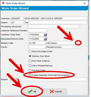 - Select the drop down in the Reason Code field. Select Add Wearer. Select Create Separate Workorder Per Inventory and OK