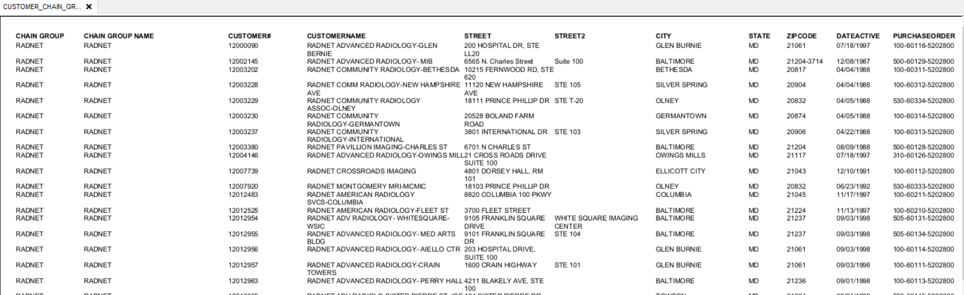 - Output: The Customer Price Group Report produces a consolidated document containing crucial customer details such as Customer Number, Customer Name, Customer Address, and Customer Purchase Order information. This output provides a holistic view of the customer landscape associated with a specific Price Group (Chain code), allowing service managers to identify trends, assess customer preferences, and tailor service strategies accordingly. The report output is typically in a format that is easy to interpret and can be shared across the Service Management team for collaborative decision-making (i.e., renewals, QBRs, etc.).