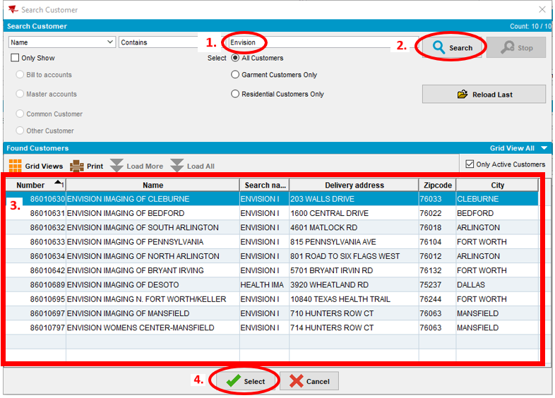 Note: In the example below, we typed Envision. All accounts in ABS with the word Envision in the name populated in the Found Customers Section.