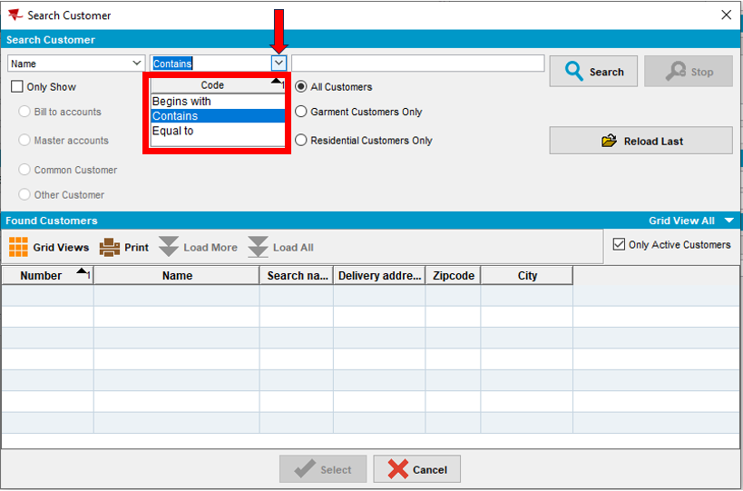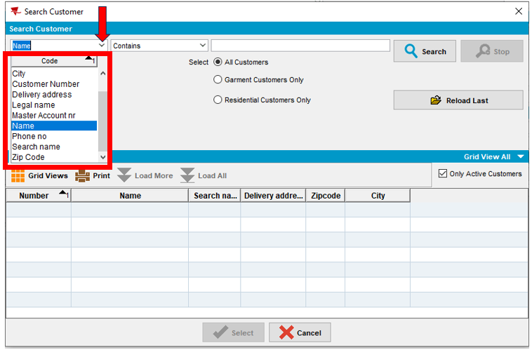 - Select the drop down and choose your method to search. Recommended search methods are Name, Address, or Customer Number.