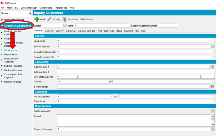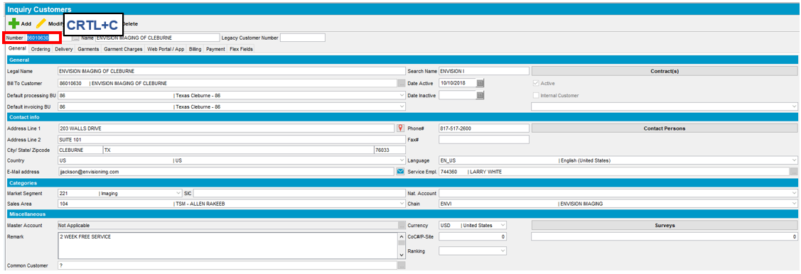 - Customer detail and account information will populate. Customer number can be used to perform other transactions within ABS. Click CTRL+C to copy the customer number and CTRL+V to paste the customer number into desired fields.