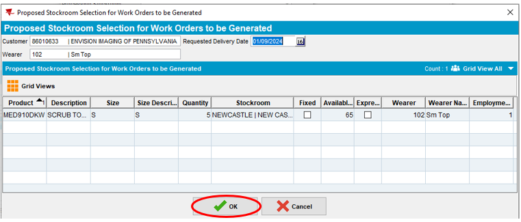 Note: Proposed Stockroom Selection of Work Orders to be Generated pop up window will appear and provides garment availability information to the Service team. This window shows the Product Code, Description, Size, Quantity, Stockroom location and Available Stock in circulation. If Available Stock shows a negative number, requested items may be on backorder and could take up to 4-6 weeks (in some cases longer) to ship and receive.