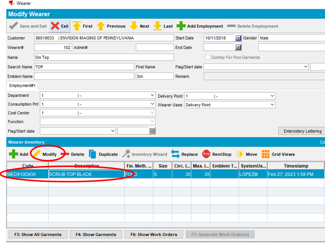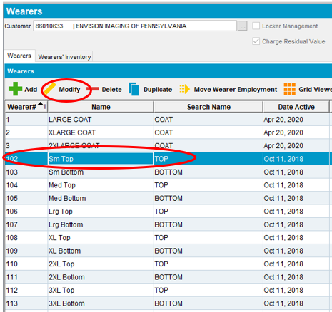 - To increase a wearers garment quantity, select the desired field under Name or Wearer# and select Modify.