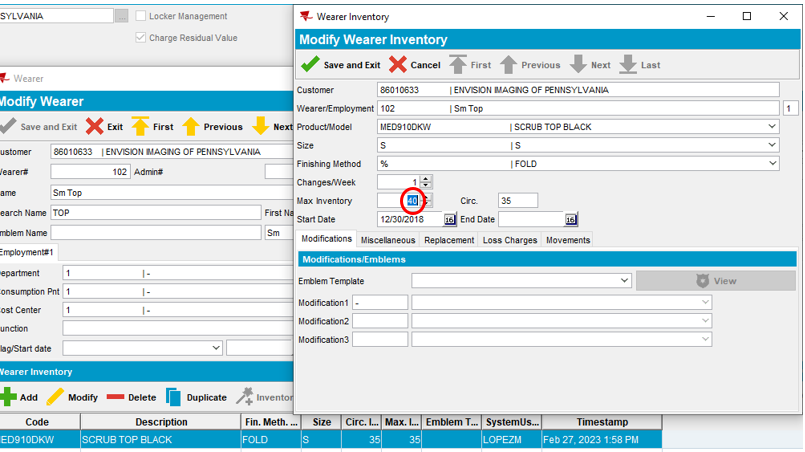 - Example: Inventory was set at 35 and the customer would like to increase scrub tops by 5, new Max Inventory should be set at 40