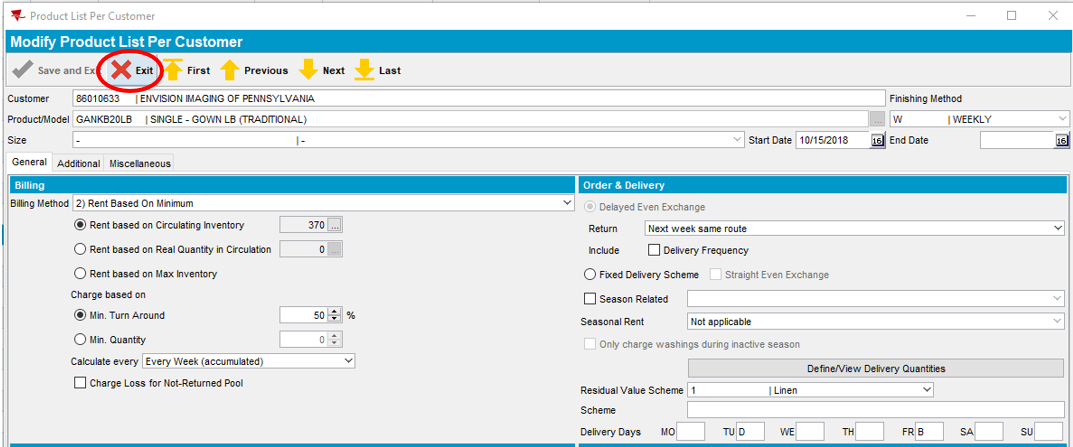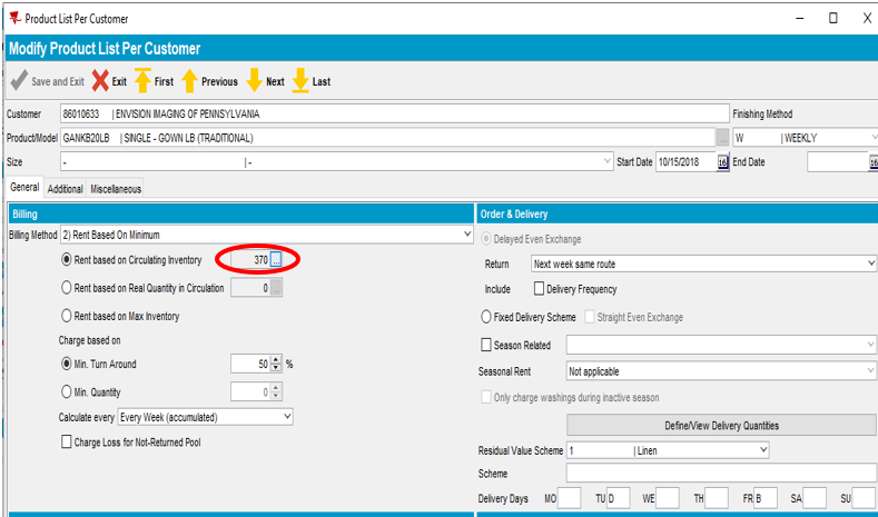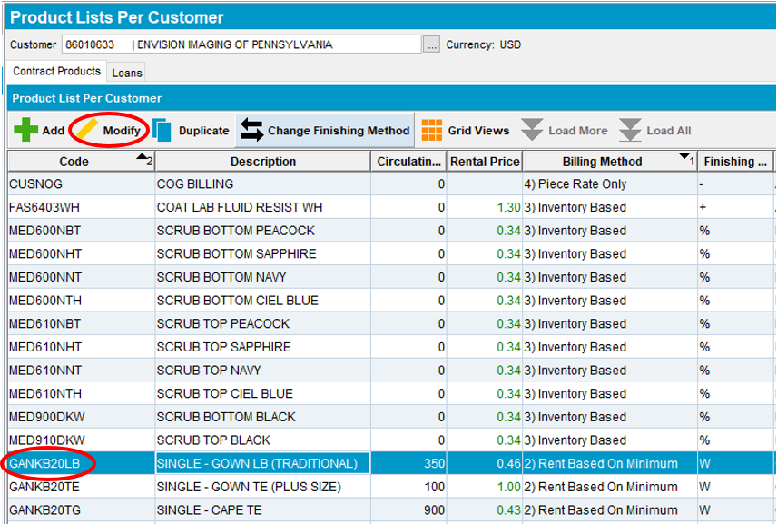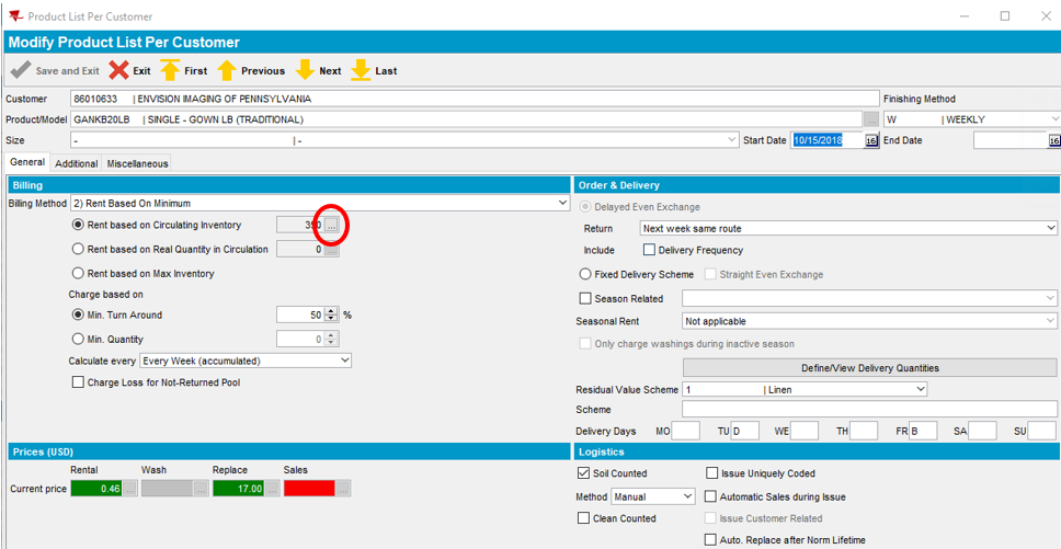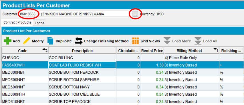 - Modify Product List Per Customer window will appear. Select ellipses in Rent based on Circulating Inventory to make adjustments.