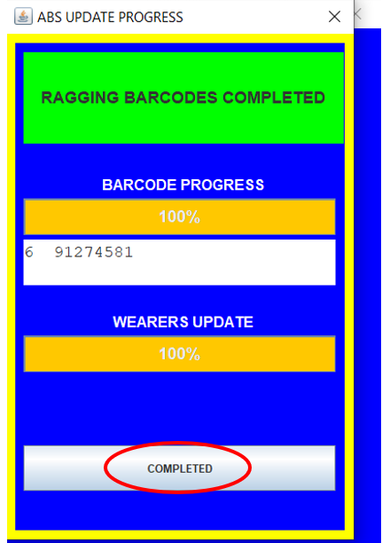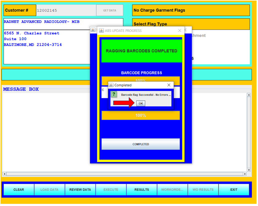 19. The ABS Update Progress pop up window will appear and remove all flagged barcodes from the customer account in ABS. Click OK once complete.