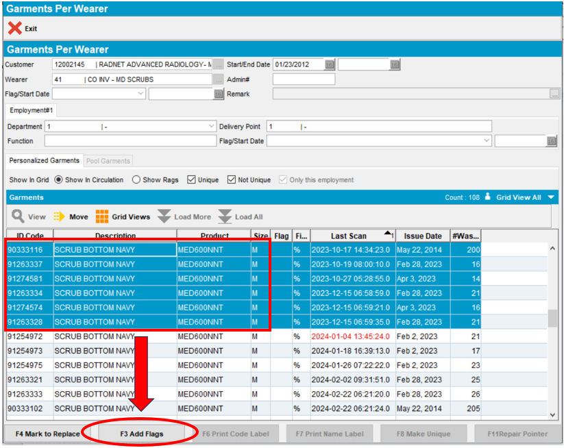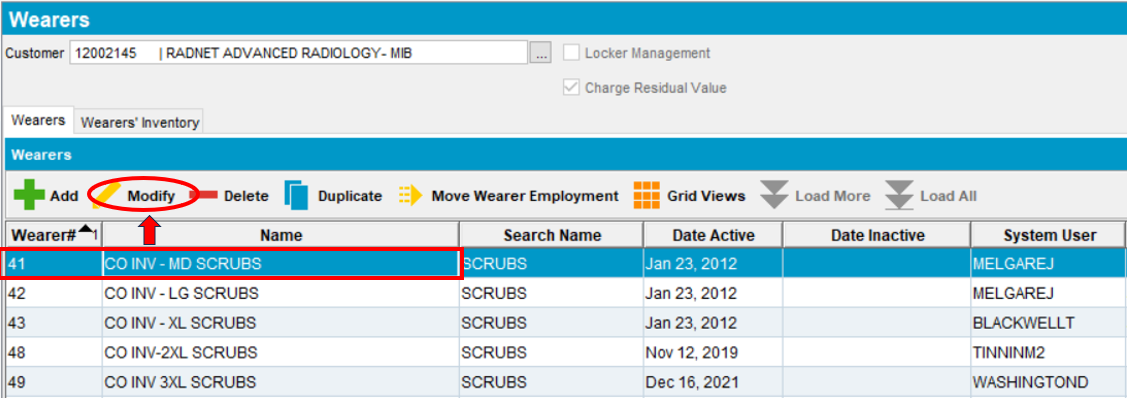 - To flag garments for Rag and Batch, select the desired field under Name or Wearer# and select Modify.