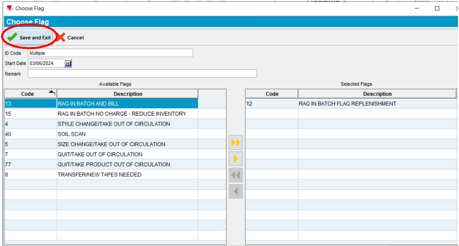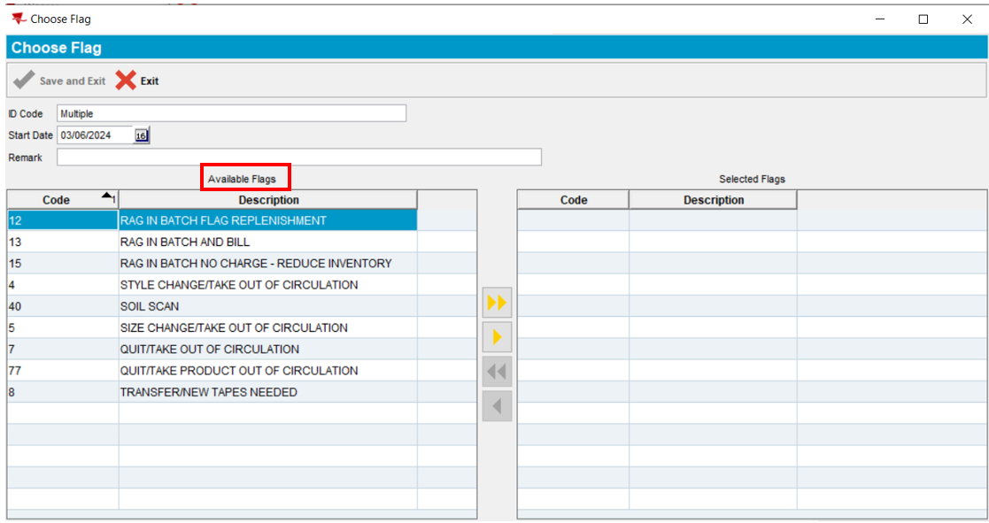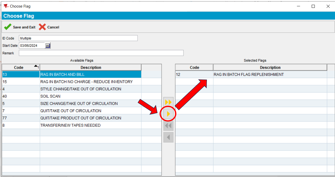 9. Select the single yellow arrow to move the Available Flags to the Selected Flags. In the example below, we selected Flag 12 – Rag In Batch Flag Replenishment (Flags instruct Plant Associates no what action to take with the garments when it is scanned in the plant).