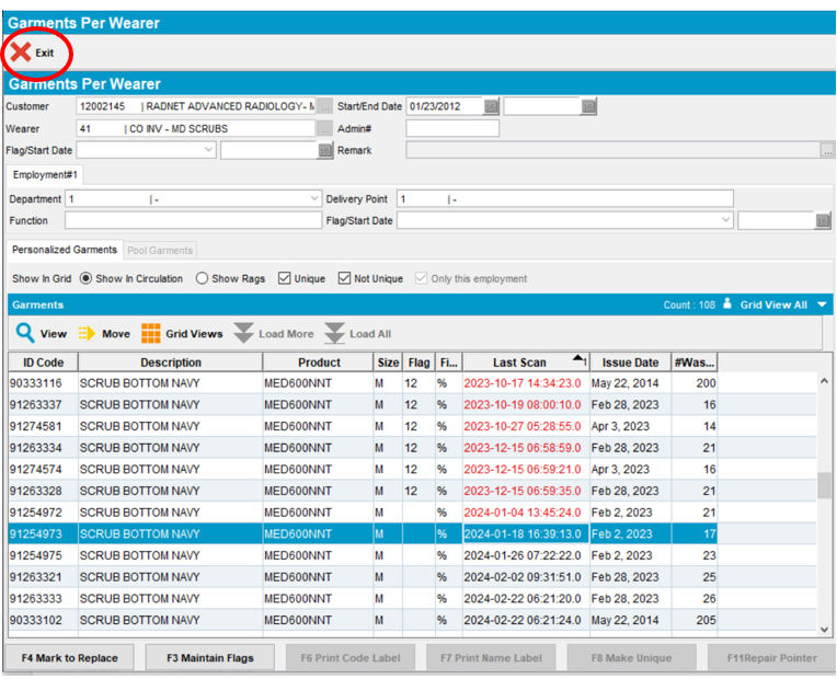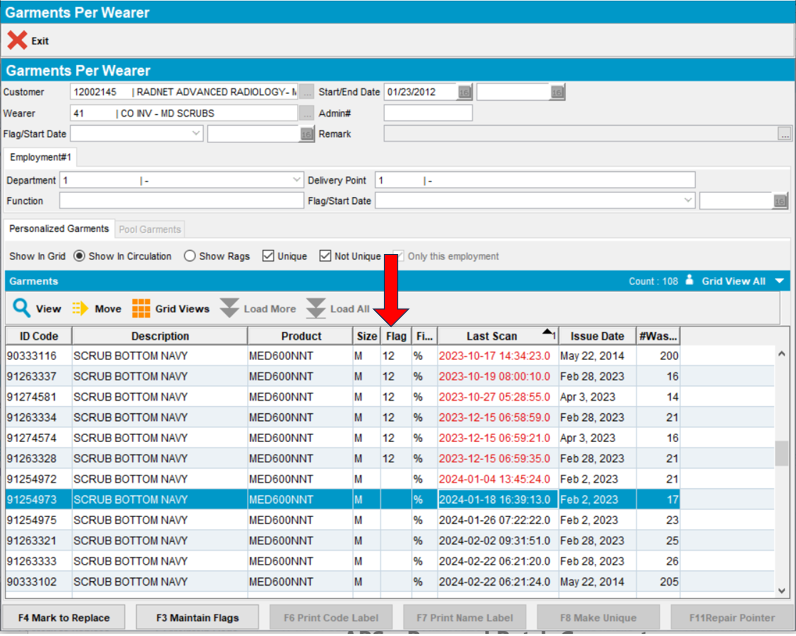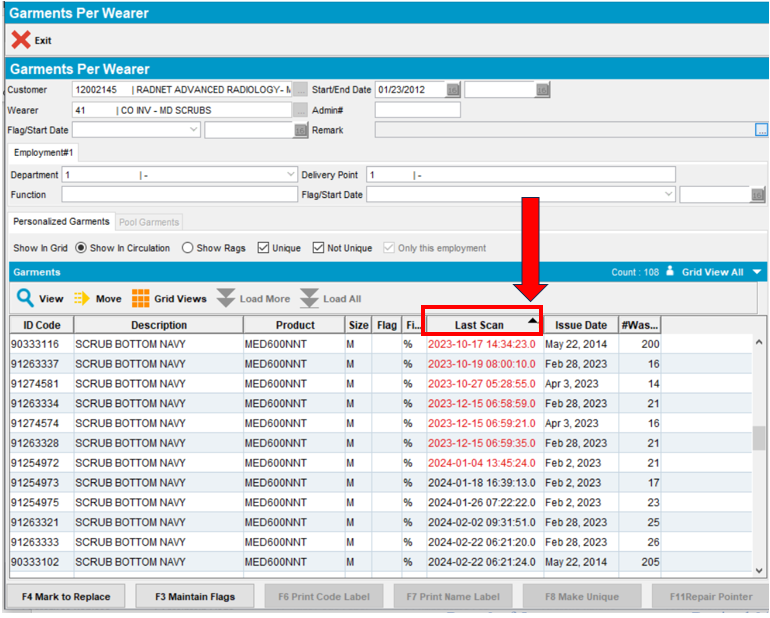 Note: Dates appear in “red” or “black” font. “Red” font signifies that an item has not be scanned by the PDA or the Plant laundering process in eight weeks or more. “Black” font signifies that an item has been scanned within the last eight weeks. Items that have not been scanned in eight weeks or more are candidates for replacement.