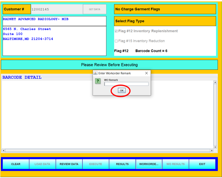 23. Enter special instructions for the Stockroom team in the Enter Workorder Remark field and select OK. If no special instructions are needed, leave blank and select OK (e.g. A special request WO Remark could be “Please rush”, “Customer needs asap”, etc).