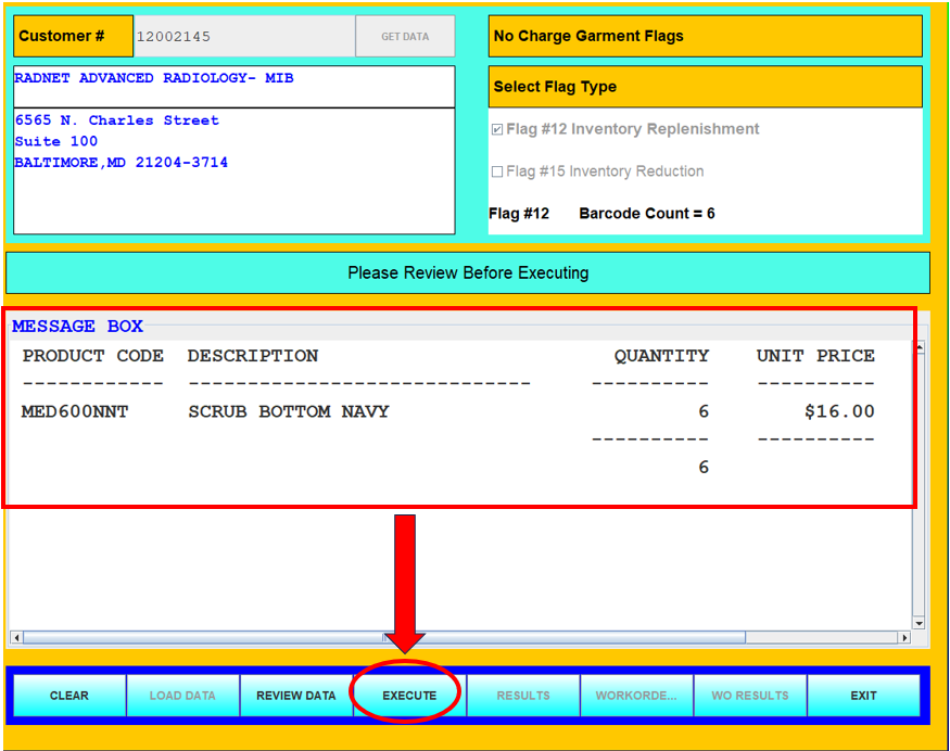 18. Product Code, Description and total Quantity will appear in the Message Box. Click Execute.