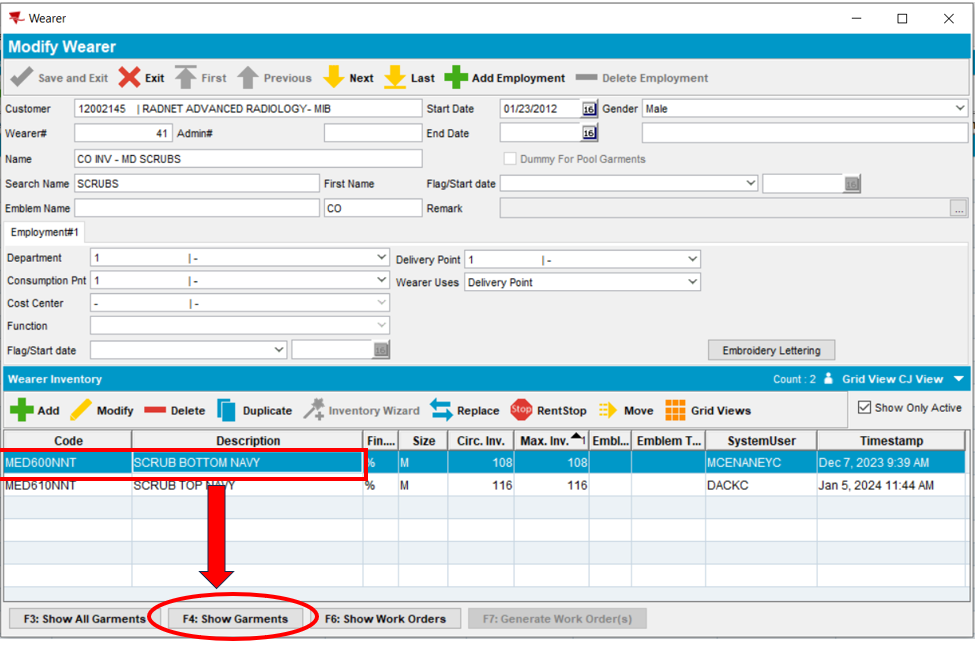 - Select the product you would like to flag for removal under Wearer Inventory and click Show Garments. If you would like to flag all products listed for the wearer, click Show All Garments.