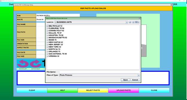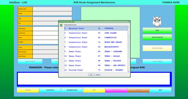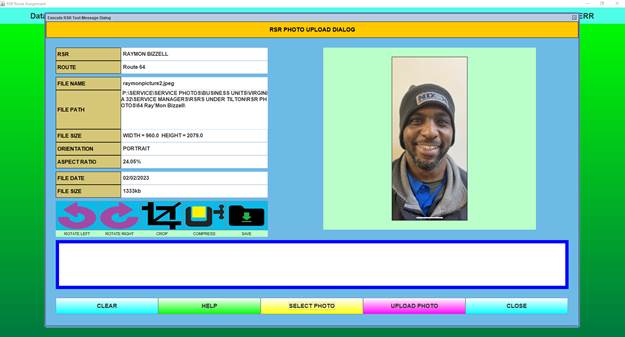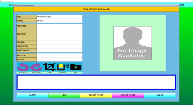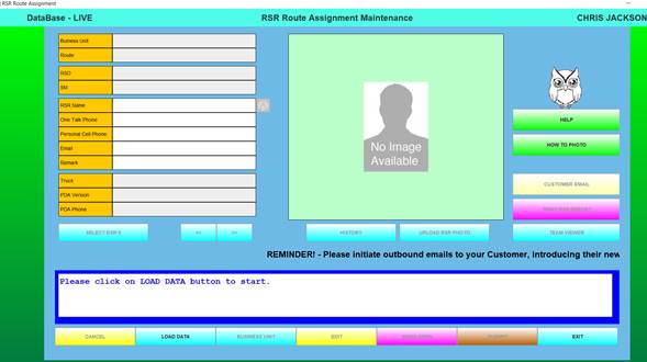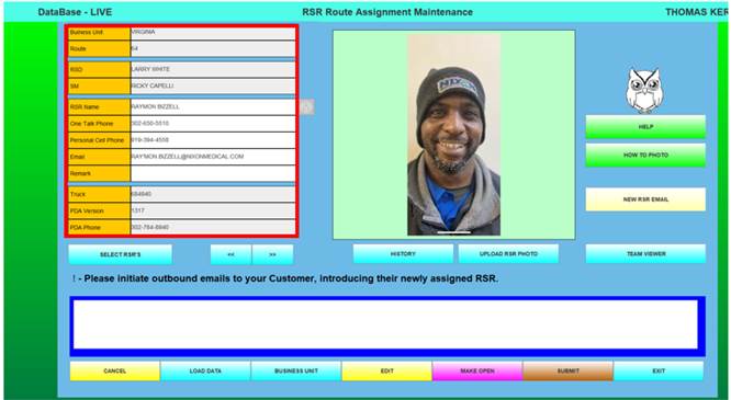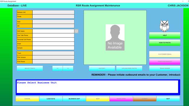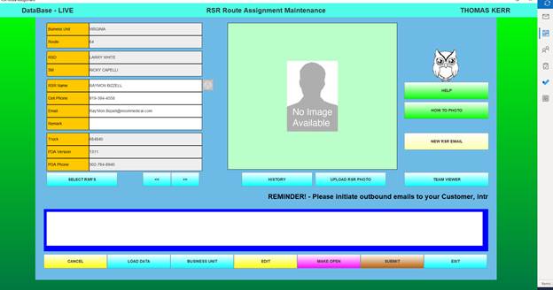 The Route Assignment Maintenance function is the process that allows RSR-specific data, along with the RSR’s photo to be stored in the database.