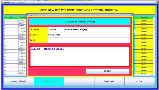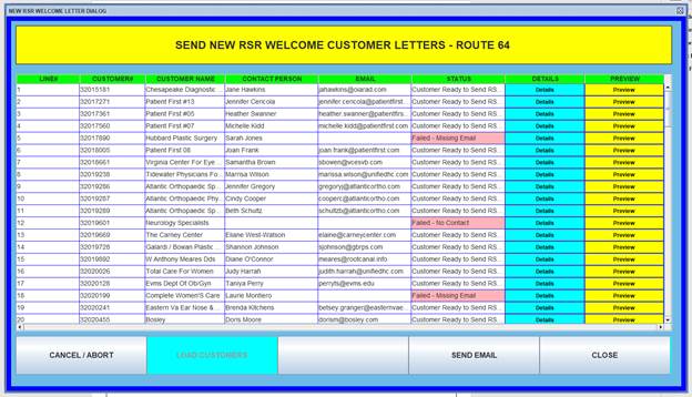 Step 22: The “New RSR Welcome Customer Letters” screen will highlight customers with missing email address in red.