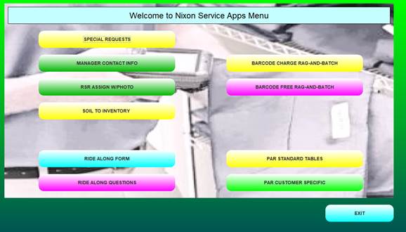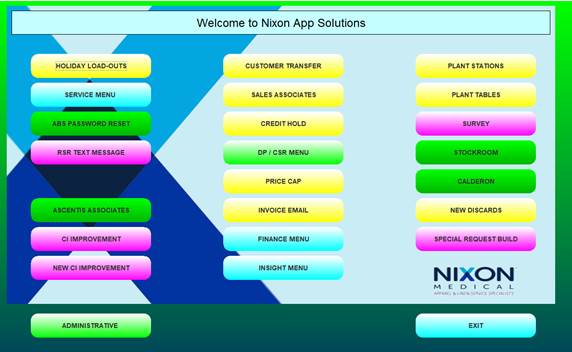 The “Welcome to Nixon Apps Solution” screen is displayed to the User when the Nixon Apps icon is selected. Many functions may be selected from this screen. For this training, we will focus exclusively on the service menu and RSR route assignment maintenance.