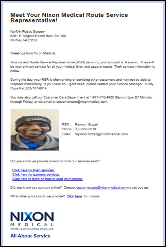 Increase the effectiveness of outbound emails to Customers by including a photograph of the Route Service Representative along with their name in the communication. The photograph adds a level of personalization to the message, helps to build name and face recognition, and helps to accelerate the building of long-term relationships that are critical to account retention.