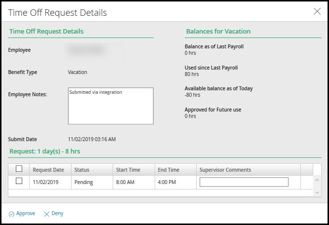 Select Expanded View to access the Time Off Requests list.Select the Submitted Date/Time link view the Time Off Request Details.View Employee Notes.Enter applicable Supervisor Comments.Enable the entry to approve and deny one or more requests.Select Deny to decline the request.Select Approve to place the TOR on the Time Card.Approved TORs display as approved hours on the employee Time Card unless the request shares a day with unapproved time.Editing the approved TOR hours on the employee Time Card causes the TOR Calendar to display a cancellation for the old request. A new approved request displays with the edited time.