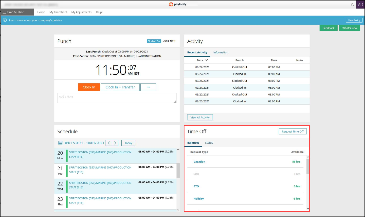 ⚠ CAUTION: Users cannot submit time off requests for days that fall within a Closed pay period.Enter the Start Time.Enter the Hours Per Day. If the Hours Per Day causes the request to carry into the following day, the request shows on both days in the Time Off Calendar.Enter Notes if necessary (255 character limit).Select Request Time Off.